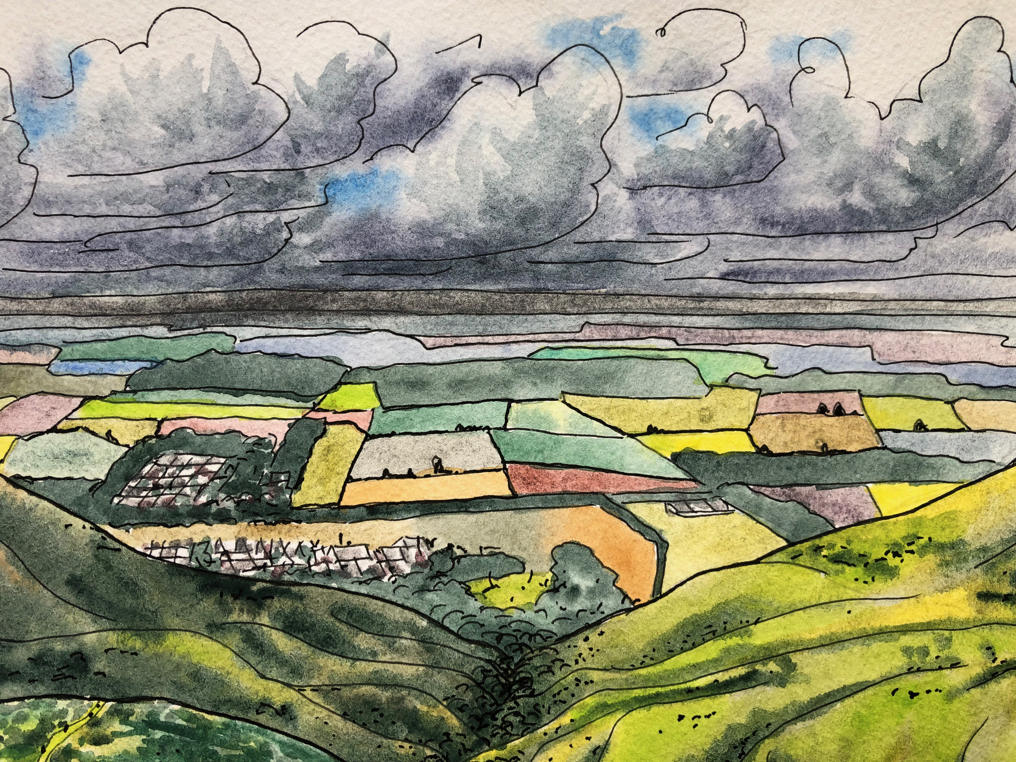 In terms of the painting, I like the pattern of the farm fields in the distance and tried to play that up with extra colors to give a patchwork feel.