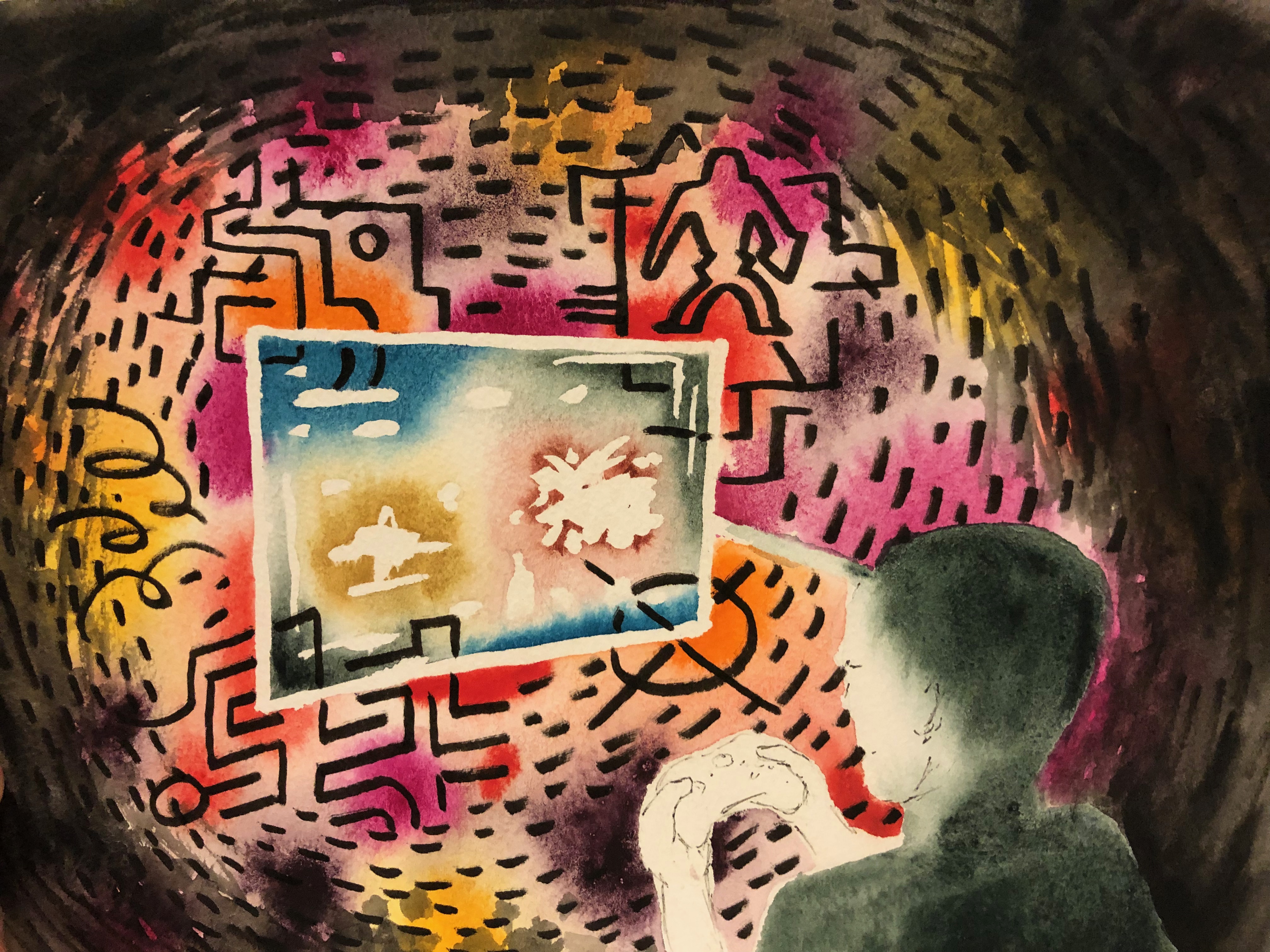 I’m not sure what this strange illustration came from, but I’ve been doing more gaming lately so it has been in my head a bit more. I had the idea to do something lighter but this illustration got darker and messier as I went.